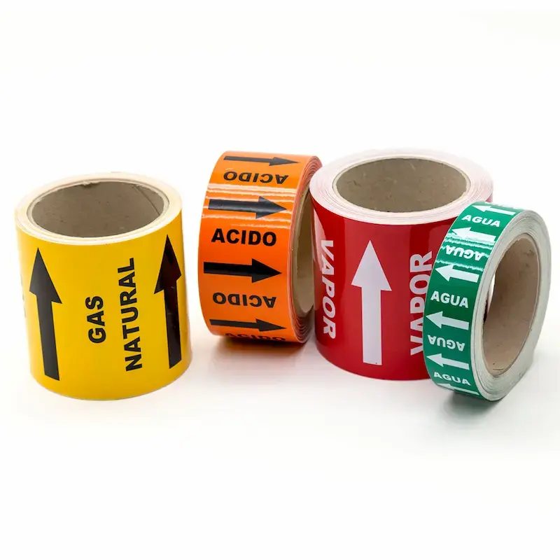 Identifica el contenido y sentido del flujo de tus tuberías con etiquetas resistentes y codificadas por color. Cumple con los estándares ANSI/ASME y evita riesgos operativos.